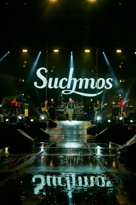 辺りが少し暗くなり始めた頃、TAIKINGの奏でる哀愁を帯びたディストーションから「In The Zoo」へ。YONCEがアコースティックギターをつま弾き繊細な歌声を聴かせていると、雨が楽曲の世界を幻想的に彩り始める。さらに壮大なナンバーの余韻を残しつつ、今度はメンバーのコーラスワークが映える新曲「藍情」が奏でられた。豊かなアンサンブルとハーモニーでオーディエンスを惹き付けたあと、メンバーは変化し続けるSuchmosのスタンスを歌った「OVERSTAND」をじっくりとプレイ。「新しい 強く優しい風」という歌詞さながらに柔らかな風がステージに向かって吹き、優しいな空気が会場一体に漂う。アウトロに入ると6人は互いの音に耳を澄ませ、息を合わせながら曲を締めくくった。
