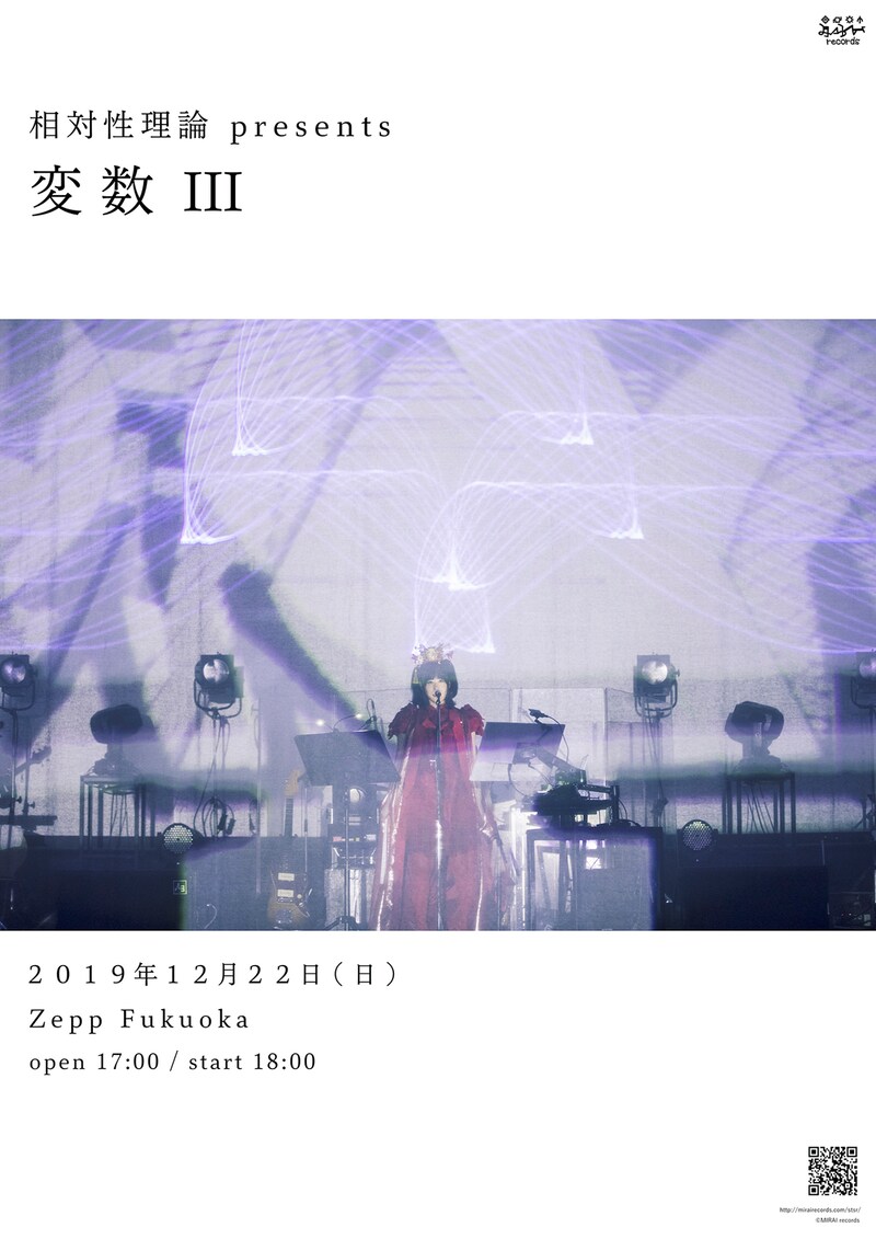 相対性理論が福岡で自主企画を行うのは2012年12月以来で約7年ぶり。この日は、2018年9月に東京・EX THEATER ROPPONGI、4月に恵比寿ザ・ガーデンホールで行われた「変数」シリーズの最終公演として開催される。