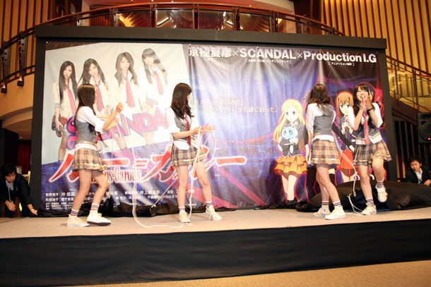 舞台挨拶にはメンバー4人のほか、原作者の京極夏彦と藤咲淳一監督も登壇。京極はアニメ化について「自分の作品がアニメ化されたというよりは、SCANDALと監督とコラボレーションしたというほうが近いと思います。僕は『小説は小説、映画は映画』と考えていて映画には一切口を挟まないんですが、今回現場を訪れたときはみなさんがすごく一生懸命作られていて『これなら大丈夫だ』と実感しました」と太鼓判を押した。また、藤咲監督は「先生の作品を舞台に青春映画を作ってしまった、という感じです。SCANDALのみんなもいろいろなことをすごくがんばってくれました」と、4人を褒めたたえた。さらに京極は「今『続編を書け』って言われてまして、まだ書いてないんですけど(笑)。みなさんの応援次第ではSCANDALとのコラボ第2弾もあるかもしれないので、よろしくお願いします」と、京極ファンにとっても興味深い発言で場内を沸かせた。