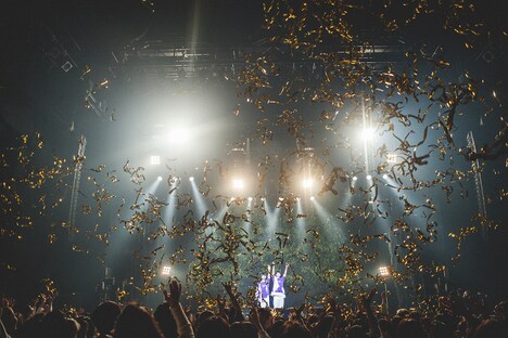 ライブ後半、2人は自分たちのアコースティックギターの演奏に加え、迫力のオケとまばゆい照明と共にステージを展開。アッパーチューン「いーでぃーえむ」などで場内の温度を上昇させていく。「ねこの16ビート」では彪我が父親のエレキギターを携え、歪みの利いたギターソロを響かせた。MCでひと息ついた彪我は、客席を見渡しながら「この間考えたんですよ。『さくらしめじってなんだろうな』って。何があったとしても、さくらしめじはさくらしめじであり続けると思うんですよ。誰かの心の中にあるだけで、さくらしめじは続いていくと思うんです」と語りだす。雅功も「終わるの!?」とツッコみつつ、「曲を聴いていないときでも、『さくらしめじのあの曲いいな』と思う瞬間があればいいなと思いました。僕らは今、あなたの心の中に胞子を撒いています」と彪我の発言に続けた。そして彪我による「We are さくらしめじ!」のコール&レスポンスを経て、ライブはラストスパートへ。彼らは「えそらごと」「ひだりむね」を熱唱したあと、名嘉俊(HY)提供のメッセージソング「合言葉」でシンガロングを巻き起こし、カラフルな紙吹雪で彩られたステージをあとにした。