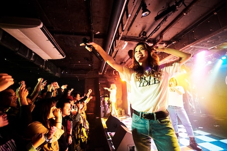 まずCARRY LOOSEはミディアムテンポのロックチューン「やさしい世界」でライブをスタートさせてから、エモーショナルなダンスチューン「戻らないように」を披露。「Deep thorns」ではパン・ルナリーフィとウルウ・ルが一際力強い歌声を聴かせ、YUiNA EMPiREとユメカ・ナウカナ?が一歩前に出て存在感をアピールした。自己紹介を挟み、CARRY LOOSEはパンキッシュでキャッチーなナンバー「pretender」、オリエンタルなメロディのシンセサウンドが印象的な「たんたかたんたんたん」で笑顔を弾けさせ、『RAKUEN」では配達員(CARRY LOOSEファンの呼称)のみならず、BILLE IDLEファンのシンガロングも誘った。