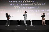 まずマイクを持った上坂は「撮り下ろしの写真集が初めてで。オールロケをしてずっとやってらっしゃるスタイリストさんがコーディネートしてくださったので、芸術点の高い感じ……になりました」と写真集を自己評価。持ち前のスタイルを生かしたランジェリーや水着でのカットについては「めちゃくちゃ露出がある感じではなく、海に行くわけでもなく、お洋服的な気持ちで着られました。仕事を始めたばかりのときは『そんなものありえない!』と思っていたんですけど、私の不思議な体型をみるにつれ、『意外とイケるんじゃないか? みんなに偽乳だと思われていないだろうか?』と。偽乳ではないことを証明する意味合いもありまして。デザインもかわいいものを選びましたし、スタイリングもお化粧も髪型も可愛くしていただいたので、『際どいな!』とかそういう感じではなかったです」と述べた。