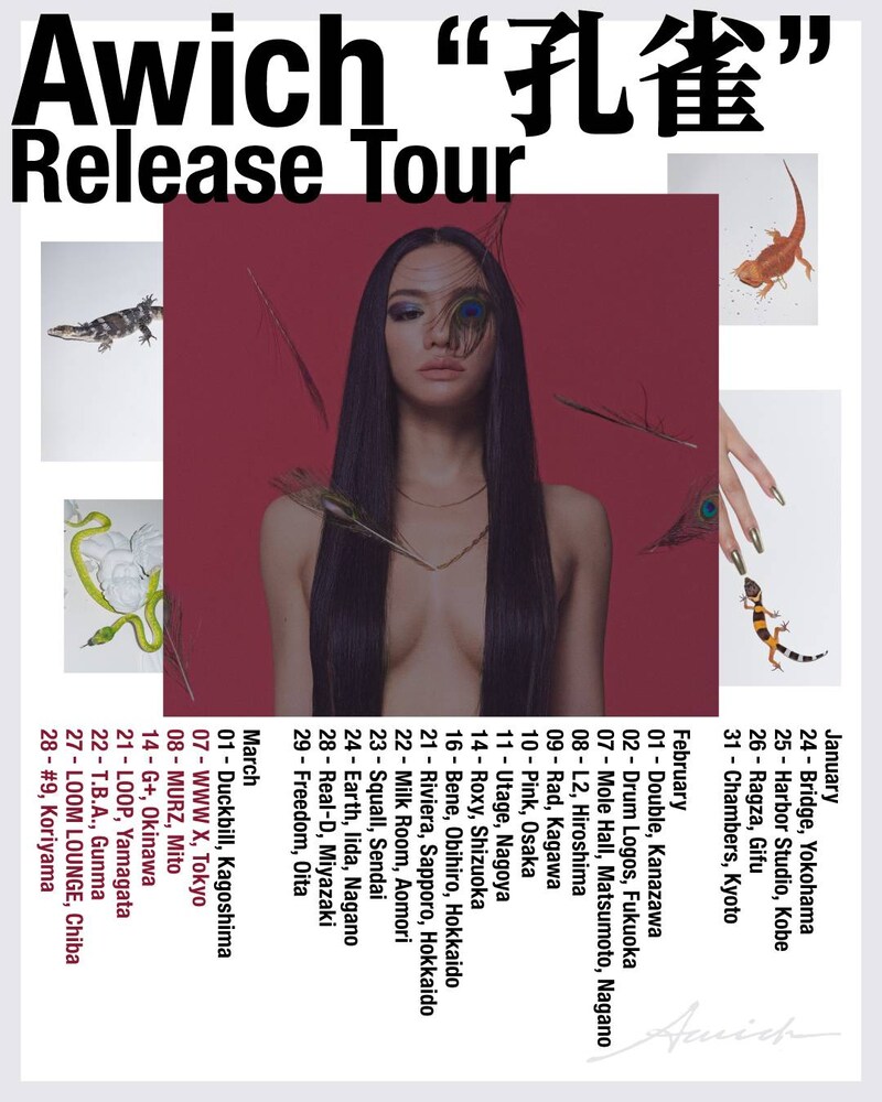 このツアーはAwichが最新アルバム「孔雀」を携えて行うもの。このたび7公演が追加で発表され、3月7日の東京公演はバンドセットのワンマンライブとなることが明らかになった。バンドメンバーは後日発表される。イープラスでは2月3日まで東京公演のチケットの先行予約を受け付けている。