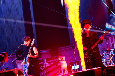 今回のツアーでは巨大なLEDスクリーンを生かした映像演出も見どころの1つ。最新作「NO DEMOCRACY」の楽曲と「笑顔の多い日ばかりじゃない」で構成された中盤のブロックでは、“言葉のアルバム”の魅力を表現するように歌詞がスクリーンに映し出される演出が続き、各曲に込められたメッセージをオーディエンスに伝えた。また同ブロックの終盤では、サビで一気に開けていくダイナミックな新曲「Into the Wild」も披露。TERUの伸びやかな歌声と盤石のアンサンブルを聴かせるナンバーで、デビュー25周年を迎えたバンドの貫禄を見せた。「AMERICAN INNOVATION」ではメンバーを模した巨大なバルーンが登場し、観客がタオルを威勢よく回したり、TERUの掛け声に合わせて手拍子をしたりと盛り上がり一体感を作り出した。