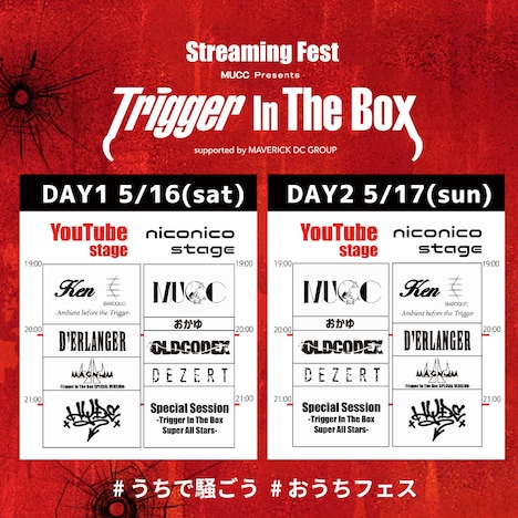 この番組は、本日5月16日と明日17日の2日間にわたりYouTubeとニコニコ動画で配信されている「Live at Trigger In The Box 2019」の裏企画。本編となる「Live at Trigger In The Box 2019」は昨年12月28日に東京・国立代々木競技場第一体育館で開催されたMAVERICK DC GROUP主催のライブイベント「