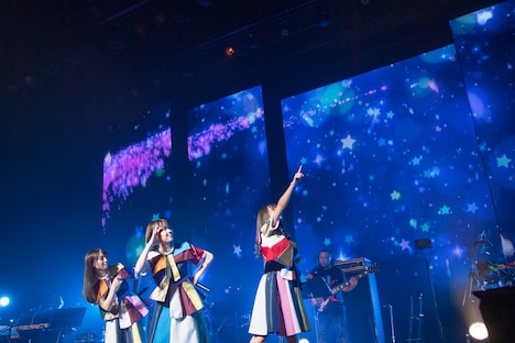 休憩時間のあと、インスト曲「海に纏わる言葉」が流れると、下りていた幕が再び上がり、キラキラと輝く水面の映像を背に並び立つ3人が現れる。ラストアルバム「deep blue」の衣装に着替えた彼女たちは「クラウチングスタート」でパフォーマンスを再開し、「Summer Plan」「タイムマシンにさよなら」「新しい朝」を畳みかける。ここでメンバーは椅子に座ると「帰り道のワンダー」「蜃気楼の国」「ブルー、イエロー、オレンジ、グリーン」「燃えない呪文」の4曲をアコースティックアレンジで披露。澄んだ歌声をじっくりと聴かせた。その後、「透明な怪物」「踊り子たち」を穏やかに歌った彼女たちは、「夏の扉」をエネルギッシュにパフォーマンス。この曲のラストではマイクスタンドを使った振り付けを初披露し、そのままスタンドを使って「ありふれた群青」を歌った。