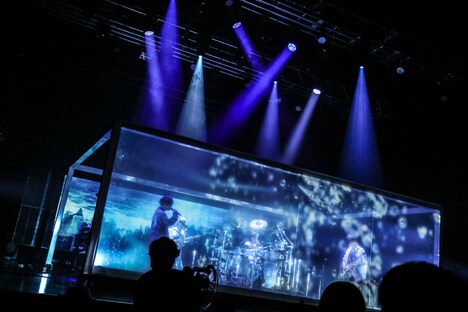 各メンバーのソロ回しを盛り込んだセッションで始まった「Shine Holder」を経て、再びMCパートに。山中による「3人に会えるだけでもエモいやん。俺はすごい感情が昂り始めてるんやけど、シゲがクールやなって思ってるんよ。さっきのセッションの感想を伝えてほしい」という前振りから、鈴木重伸(G)が次に起こす行動の選択肢「弾き語りで伝える」と「普通に伝える」がバックスクリーンに映し出される。アンケート結果を受けて、鈴木はギターを爪弾きながら、語り口調で思いを伝えた。続いて「嫌い」と「接触」の2択のうち、票を多く獲得したのは「接触」。4人は重低音を轟かせながらダークな世界観を表現した。ここで黒幕が降りたあと、「From Dusk Till Dawn」ではステージの前に設置された小舞台に置かれた椅子に山中が座り、エフェクトの効いた歌声を披露。さらに最新アルバム「SUCK MY WORLD」の収録曲「Breathe」が演奏され、浮遊感のあるダンサブルなサウンドによって場内に幻想的なムードが醸し出された。