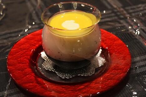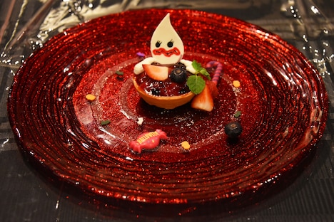 店内で提供される食事、デザート、ドリンク類は従来通りいずれも京が監修に携わっており、メニュー名やメニューのイラストにもこだわりが反映されている。今回フードメニューとして考案されたのは、タイの名物である蟹カレー「カニガニの逆襲、プーパッポンカレー」、白い卵で包まれたオムライスが特徴の「オムライスがホイなのか、ホイがオムライスなのか」、ジューシーかつ柔らかい骨付き仔牛肉が味わえる「マイエルが殺戮した“アレ”の肉」、煙の演出が幻想的な「ゼメキス家の放置された冷たいスープ」の4品。スイーツには、まろやかな味が楽しめるパンプキンチーズケーキ「今宵お前は呪われる(パンプキンの呪い)」、鮮血のようなプレートの上に乗るキュートなタルトが魅力の「ペニュ食べすぎベリータルト」、ラムレーズン入りガトーショコラにコーヒーゼリーとアイスをトッピングした贅沢な「ど腐れライミラムレーズン病」の3品がラインナップされている。ドリンクはいずれも仕掛けが用意され、味だけでなく見た目も楽しいのが特徴だ。店長曰く、今回のメニューの中でのオススメは「カニガニの逆襲、プーパッポンカレー」とのこと。