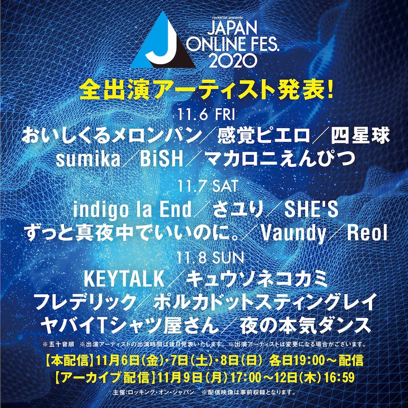 11月6日(金)~8日(日)に開催されるオンラインフェス「JAPAN ONLINE FESTIVAL 2020」の全出演アーティストが発表された。