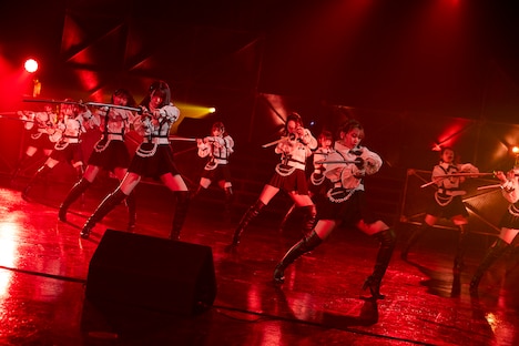 本日11月4日に発売されたシングルの表題曲「何人(なんびと)も」は殺陣のパフォーマンスを振り付けに取り入れた楽曲で、刀を振り回すスタイリッシュなダンスが特徴。イベントの開始時間になると、SEに合わせてラストアイドルがカメラの前に登場し、さっそくこの曲を選抜メンバー21名で披露した。迫力のあるパフォーマンスが届けられたあとは、映画「銀魂」シリーズや映画「進撃の巨人 ATTACK ON TITAN」でアクション監督を務め、今作でメンバーに殺陣を指導した田渕景也や、振り付けを手がけたakaneからのメッセージ映像が流れ、メンバーは「何人(なんびと)も」や殺陣についてトーク。阿部菜々実、大場結女、小澤愛実、西村歩乃果、籾山ひめり、安田愛里の6人は鬼気迫る殺陣の立ち回りの一部を披露し、ステージ上で刀を持って斬り合った。