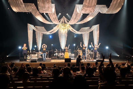 バンドメンバーが1人ずつ「おうち時間」を振り返るアットホームなMCを挟み、ライブは後半戦へ。なごやかなトークから一転、有安はコロナ禍に感じた葛藤を打ち明け、「今日ここにいる皆さん、いろんな理由でここに来られなかった皆さんにも届けたい」と熱い思いを込めて「小さな勇気」を披露。さらにDREAMS COME TRUEのカバー「何度でも」へとつなげた。そして「Catch up」「TRAVEL FANTASISTA」「Another story」とアップテンポな3曲を畳みかけてライブは終了。照明が点いて明るくなった客席を見渡し、有安は笑顔で大きく手を振った。