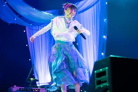 続く新曲「Do you know」ではブルーとピンクの照明が怪しくステージを照らす中、有安がキレのあるダンスを披露。くるりとターンを決めると、ロングスカートが軽やかにはためく。ジャジーなナンバー「愛されたくて」、新曲「LAST SCENE」と3曲連続のダンスパートを終えると、有安は「ここでカバー曲を」と、子役時代やオーディションを受けていた頃によく歌っていたというMISIAの「Everything」を熱唱した。昨年3月の再始動ライブから歌われている「虹む涙」は、グランドピアノとウッドベースが印象的なアレンジに。さらに8月に配信リリースされたミディアムバラード「ナツオモイ」とじっくり聴き入る楽曲が並んだが、その後の「Drive Drive」は通常なら観客が一斉にタオルを回して盛り上がるナンバー。この日の会場では半分に折り畳まれたタオルが小さく回る、これまでとは違った光景が広がった。