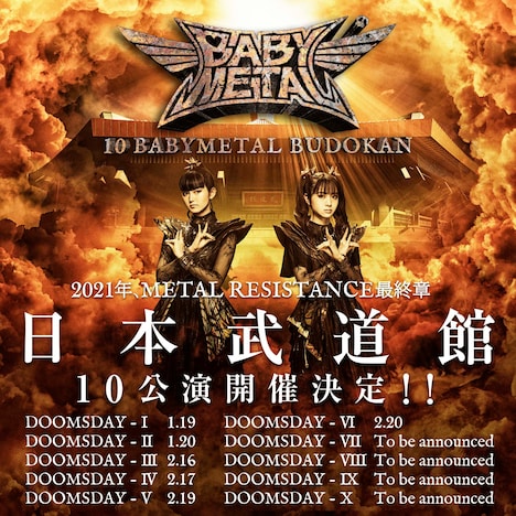 本日12月12日にメンバーズサイト「THE ONE」会員限定でライブ映像配信企画「STAY METAL STAY ROCK-MAY-KAN」が行われ、公演日程はこのイベントの最後に発表された。全10公演が予定されている「10 BABYMETAL BUDOKAN」のうち、今回明らかになった日程は1月19、20日と2月16、17、19、20日の6公演。残る4公演のスケジュールは、後日アナウンスされる。