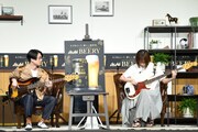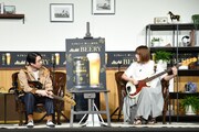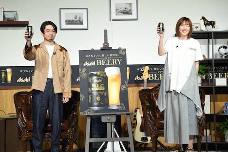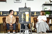 部屋をイメージしたステージに本田とともに登場したハマは、自己紹介で「自分でもまだ、このツーショットがドッキリなんじゃないかと思っております!」と率直な思いを明かして会場の笑いを誘った。さっそく「アサヒ ビアリー」で乾杯した2人は、缶を片手にトークを展開。それぞれ異なるシチュエーションで実施されたCM撮影について、本田は「私は慣れ親しんだゲームをしながら、リラックスしてできました」と語り、一方のハマは「僕は経験がないのでガチガチでした。許可をいただいて、普段一緒にいるスタッフさんと話しながら撮影をしましたね(笑)。役者さんって、皆さんすごいなあと思いました」と振り返る。そして「アサヒ ビアリー」を味わった印象について、ハマは「本当のビールの味で、大変おいしいです」とコメント。MCにどんなシチュエーションで飲みたいかを問われると「曲を作る現場ですかね。真面目にやっていてもなかなか進まないこともあるので。許されるならずっと飲んでいたいですけど(笑)、これならちょうどいいんじゃないかなと思います」と提案した。