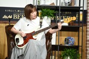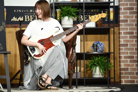 缶を片手に2人が和やかに会話を楽しんでいると、MCはステージの後方に置かれていた2本のベースに着目。ここからハマは、本田にベースをレクチャーすることになった。ベースを抱えた本田の姿にハマは「すごい画ですね! 皆さん、たくさん(写真を)撮ってください!」と喜び、「ド」の音を出す方法を彼女に伝える。本田は「1度しか触ったことがないです」と自信なさげな様子だったが、彼女のベースからはしっかりと音が鳴り、ハマは「お上手ですね!」と笑顔に。そして、本田が何気なく弾いていた様子を見ながら「それ、ツーフィンガー(奏法)って言うんですよ。すごくお上手です(笑)」と感心し、本田「ド」の音に自分の演奏を重ねてセッションを展開してみせた。