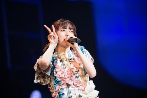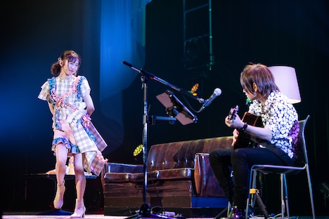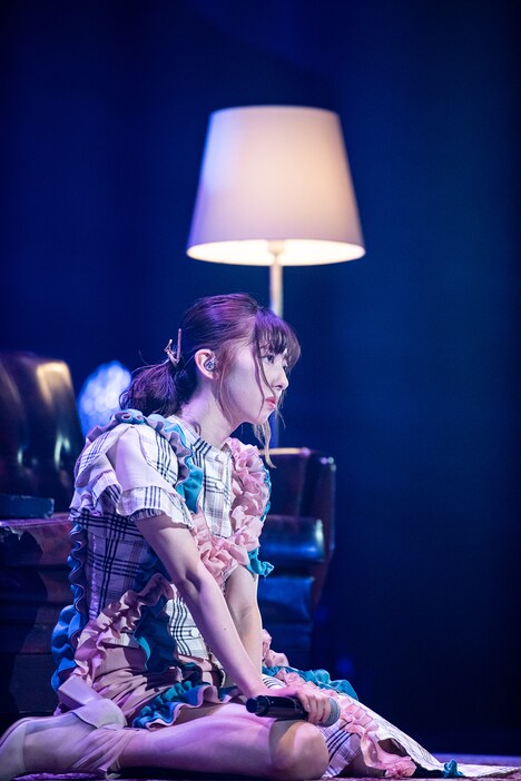 その後は「テブラデスキー~青春リバティ~」を笑顔とともに元気よく熱唱。かと思えば「イー・アル・サディスティック」でクールなダンスパフォーマンスを繰り広げ、「I'll be here」をソウルフルに歌うなど、その表現力の豊かさを存分に見せつけた。ここで真山は、カーペットが敷かれ、ソファや照明スタンドが置かれた今回のステージのコンセプトを“真山のおうち”と説明。「外出するのが難しい中でも、私とみんなの心はつながっているんだよ、という思いでライブをさせてもらっています」と思いを明かした。