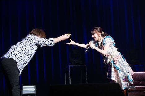 なごやかにトークを進めていた2人だが、真山は唐突に「焼きそばパンを買ってきて」と三沢におつかいを促す。1人ステージに残った真山は、ファミリーにパラパラの振り付けを指導して「Shen-Shen Passion Night」をパフォーマンス。ファミリーと一体となったダンスでフロアの熱気を高めた。続いてステージを縦横無尽に飛び跳ねながら「あなたのダンスで騒がしい」を歌い終えたところで、焼きそばパンを手にした三沢が登場。再び2人そろってのカバー曲に突入した。「さっきはエビ中ではなかなか歌えない“大人の恋愛ソング”だったんですが、このあとは自粛期間中の『誰かに会いたい』と思っていたときに力をいただいた曲を」と真山が紹介して歌ったのは、椎名林檎の「ありあまる富」とフジファブリックの「虹」。まったくタイプの異なる2曲を通じ、自身の思いをファミリーに伝えた。