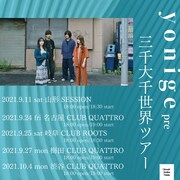 yonigeは8月18日にリリースする新作「三千世界」を携えて、山形・山形ミュージック昭和Session、愛知・名古屋CLUB QUATTRO、岐阜・CLUB ROOTS、大阪・梅田CLUB QUATTRO、東京・渋谷CLUB QUATTROの5カ所を回る。イープラスではチケットのオフィシャル先行予約を8月22日まで受け付けている。