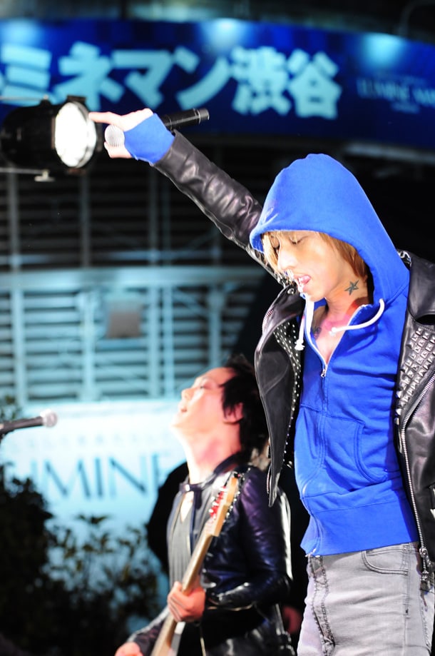 鮮烈なギターのカッティングから1曲目「少年」がスタート。清春はモニターに上がり、新宿駅前を見渡すようにしながら歌い上げ、人時もヘビーなベースを鳴らす。しかしワンコーラスが終わったところでステージ上のスタッフが腕で大きく×印を出し、音量が急速に小さくなる。そのまま演奏は中断され、清春はファンに向けて「ごめん」と一言言い残し、メンバー全員がステージを去った。