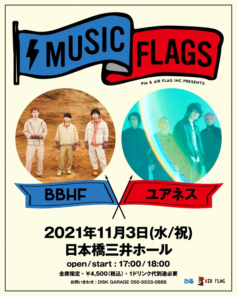「PIA & AIR FLAG Inc Presents "MUSIC FLAGS"」は、ぴあとAIR FLAG Incが共同で立ち上げたライブイベント。記念すべき第1回は、「コロナ禍の今だからこそ安心安全にコンサートホールで座って楽しむロックの楽しみ方」をテーマに実施される。当日BBHFとユアネスがどのようなパフォーマンスを繰り広げるのか、ファンは楽しみにしておこう。