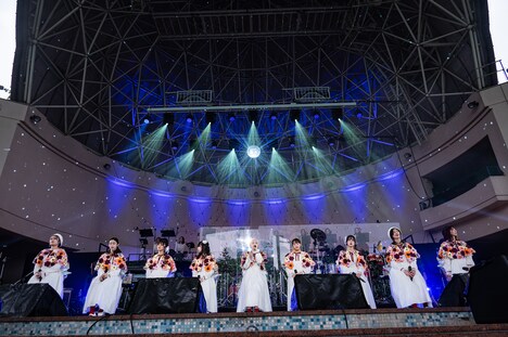 開演時刻を迎えたステージに最初に響いたのはドラムとパーカッションの音色。その後トーチの炎が舞う中、バンドメンバーが順番に姿を現し、情熱的なラテンのリズムを刻んでいく。そして白いワンピースに花をあしらったローブ姿のエビ中メンバー9名がMONDO GROSSOの「LIFE feat. bird」を歌いながらステージに登場。現体制のメンバー全員で初めてステージに立つと、9人は時折視線を交わしながら笑顔で美しい歌声を響かせた。