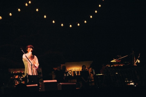 シティポップ感のあるナンバー「Jamaica Dynamite」では背景が夕焼けのように染まり、心地のいいカッティングギターと軽やかに跳ねるドラムのサウンド、艶やかな歌声がムーディな空気を生み出す。繊細なタッチの鍵盤の音色でスタートしたのは「溶けた体温、蕩けた魔法」。そのシンプルなサウンドに乗せて、片岡はポツリポツリと思いを吐き出すようにじっくりと歌を届け、サビでは黒田のコーラスが寄り添うように重なった。しっとりとした空気の中でsumikaはアコースティックギターの柔らかなサウンドが印象的なラブソング「願い」を演奏。さらにスポットライトが放つ眩い光に包まれながらバラードナンバー「本音」をまっすぐに奏でた。