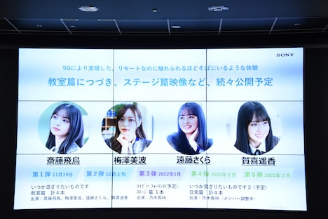 その後、齋藤と梅澤はステージ上で「いつか混ざりたいものです」教室編をXperia Viewを使って視聴。ヘッドセットを付けた2人は「肌が! 恥ずかしい!」「賀喜がここで似顔絵を見せてくれる」と手を伸ばしたり、いろんな方向を向いたりしながらコンテンツを楽しんだ。ヘッドセットを外した齋藤は「一緒にいるように感じるとかじゃなくてもう隣に“いる”んですよね。リアルすぎて。一緒にいる感じで楽しめるくらいの浅い感じじゃなくて。本当にここにいると思いました。手が伸びちゃう」と感想を語る。梅澤も「みんなかわいいです。 観てくださる方により近くに感じてもらえるように工夫したのですごく近い! こんなに近い距離でメンバー見れることはない。奥行きのある空間で臨場感がありました。さっきプレゼンしたものも全部1つひとつ叶えてほしいです」と今後の展開に期待を寄せた。またイベントの最後に齋藤は「『ここでしか観られない』という言葉はよく聞きますが、これは本当にXperia Viewじゃないとできない。さっき私たちが企画したことがこれからできるかもしれないと思うと楽しみ。ぜひ皆さんも手にとって体験してもらいたい」と熱弁した。