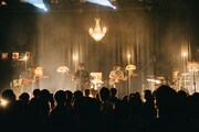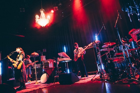 今年9月に1stアルバム「ingredients」をリリースしたchilldspot。アルバムの発売を記念して企画された10月の初ワンマンライブのチケットが即日完売したことを受け、追加公演の開催が決定した。定刻を少し過ぎた頃、chilldspotは天井から吊るされたシャンデリアなど、1stアルバムの収録曲「Groovynight」のミュージックビデオの世界観を連想させるステージに登場。1曲目にスローナンバー「落下飛行」をセレクトすると、比喩根(Vo, G)が繊細な歌声を会場に響かせて序盤からオーディエンスを惹きつけていく。その後は余韻を断ち切るように、「dinner」「Monster」といったダンスナンバーをプレイ。ジャスティン(Dr)の力強いドラムを起点にスタートした「人間って。」では、徐々に迫力を増していくバンドサウンドで観客を圧倒した。