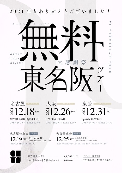 このツアーの各公演には、有料の前方優先エリア用チケットに加え、ドリンク代のみの「いつもありがとう無料チケット」が用意された。チケットの一般販売は11月22日にスタート。詳細についてはグループのオフィシャルサイトやTwitterの公式アカウントで確認を。