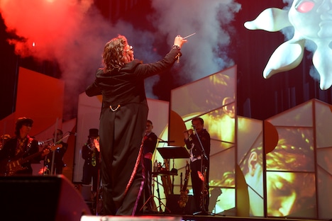 BIG HORNS BEE+のナンバー「African Fever」ではテキーラまさはるが真紅のマーライオンの着ぐるみ姿でアジテートし、会場内に熱いビートを響かせる。そしてステージ上にスモークが焚かれる中、紅白の甲冑姿のジェームス小野田が華々しく登場しライブのクライマックスを迎えた。小野田はヘヴィなロックアレンジの「紅い人」を熱唱し客席を圧倒。「インサート デザート」では小野田と石井のパワフルな歌声、メンバーが鳴らすグルーヴが会場を揺らすが、曲中の石井の小芝居パートではスケッチブックを手にしたBIG HORNS BEE+が写生大会を始めるなど、ファイナルならではの大脱線で客席を沸かせた。