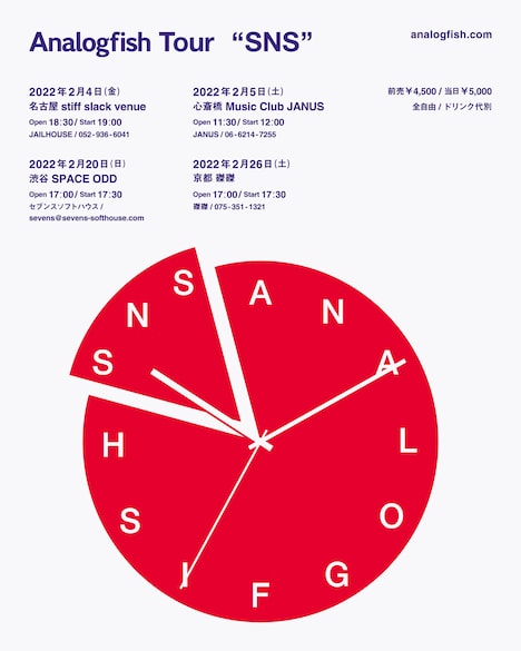 本日12月8日に約3年ぶりのニューアルバム「SNS」をリリースしたAnalogfish。新作を携えた今回のツアーは愛知、大阪、東京、京都の4都市にて行われる。公式ファンクラブでは12月12日までチケットの先行予約を受け付けている。