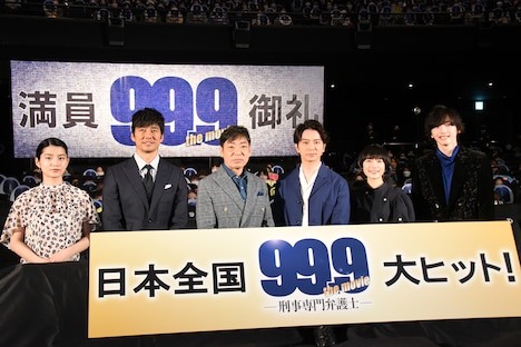 さらにキャスト陣のトークは止まらず、香川は「『99.9』は台本があってないようなもの。みんな台本をいじるのが大好きなんですよ」と愛のある毒舌を吐く。この流れで登壇者は本作の魅力をひと言で表していき、松本は「スタッフ一同が夢を乗せる映画」と答え、「僕らキャスト陣もスタッフも、この映画の内容みたいに最後まであきらめずに何がベストかを探り続けました。エンタメをたくさんの人たちに届けたい、お客さんを少しでも楽しませたいという思いを行動に移した結果、こうして皆さんに届けられてうれしいですね」と真摯に語った。また公開前の完成報告イベントでこの映画に対し、99.9という点数をつけた松本。今回も同様の質問が投げかけられると彼は「100でしょ」と断言。「皆さんのおかげで100点になりました。110、120、130にしていくのは皆さんです!」と声を張り上げた。