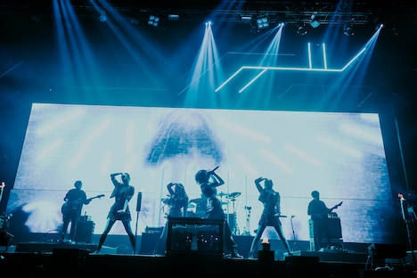 開演時刻になると、ステージ上にスモークが漂い始め、SEに合わせたオーディエンスの手拍子に迎えられながら、まずはバンドメンバーがステージへ。そしてステージ後方の巨大なスクリーンが上下に割れると、その間から黒い衣装に身を包んだメンバーが姿を現した。南菜生の「日本武道館、楽しんでいこうぜ!」という力強い煽り、昨年8月に加入した有馬えみりによる迫力のシャウトとともに、ライブはメジャーデビュー曲である「MISS UNLIMITED」で幕開け。会場内を交差するレーザーや楽曲の世界観を視覚化したVJ演出が4人のパフォーマンスを彩る中、勢いそのままにインディーズ時代の代表曲「Toxic」へとなだれ込んだ。新体制初シングルとして昨年11月に発表された「Freely」では、ステージから勢いよく火柱が噴出。オートーチューンがかかったボーカルやバンドが放つひりつくようなサウンドに合わせ、ハッカーたちは手を掲げたり、体を揺らしたりと序盤から思い思いにライブを楽しみ、会場に熱い一体感を生み出していった。