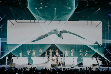 さらに「Remnants of my youth」「STARRY SKY」と畳みかけた4人は、ここで自身の胸の内をそれぞれ言葉に。真剣な表情で耳を傾けるハッカーに向け、感謝の思いを丁寧に伝えていった。そして南の「こういう景色を見ちゃうとどこまでも行けるような気がします。私にはその自信があります。なので、PassCodeにどうぞ付いてきてください。よろしくお願いします」という呼びかけを経て、ライブはとうとうクライマックスへと突入。「Anything New」「Ray」では再び上下に開いたスクリーンの向こう側から10名のストリングス隊が登場し、オーディエンスを驚かせる。PassCodeにとって初の試みとなったこの演出は、本公演のハイライトとなった。