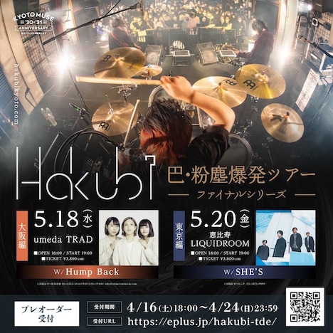 「巴・粉塵爆発ツアー」はHakubiが3月から4月にかけて全国10カ所を回ったツアーで、各地でソールドアウトを記録した。追加公演は5月18日に大阪・umeda TRAD、5月20日に東京・LIQUIDROOMで開催。大阪公演に