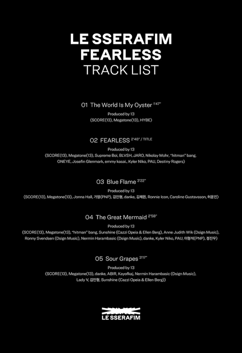 ミニアルバムにはタイトル曲のほか、「The World Is My Oyster」「Blue Flame」「The Great Mermaid」「Sour Grapes」の計5曲を収録。パン・シヒョク総括プロデューサーがタイトル曲「FEARLESS」と「The Great Mermaid」の作曲に、メンバーのキム・チェウォンとホ・ユンジンが「Blue Flame」の作詞にそれぞれ参加した。
