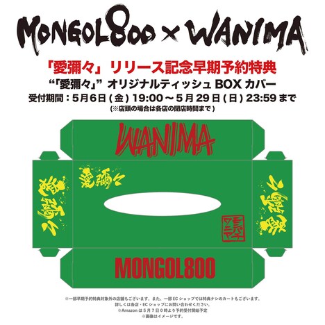 また2組によるツアー 「MONGOL800×WANIMA -愛彌々- TOUR 2022」が8月から9月にかけて行われることも決定。ツアーは8月15日の大阪・オリックス劇場から9月11日の沖縄・沖縄コンベンションセンターまで計5カ所で開催される。「愛彌々」には封入特典として本ツアーのチケットの先行抽選予約権が付属する。