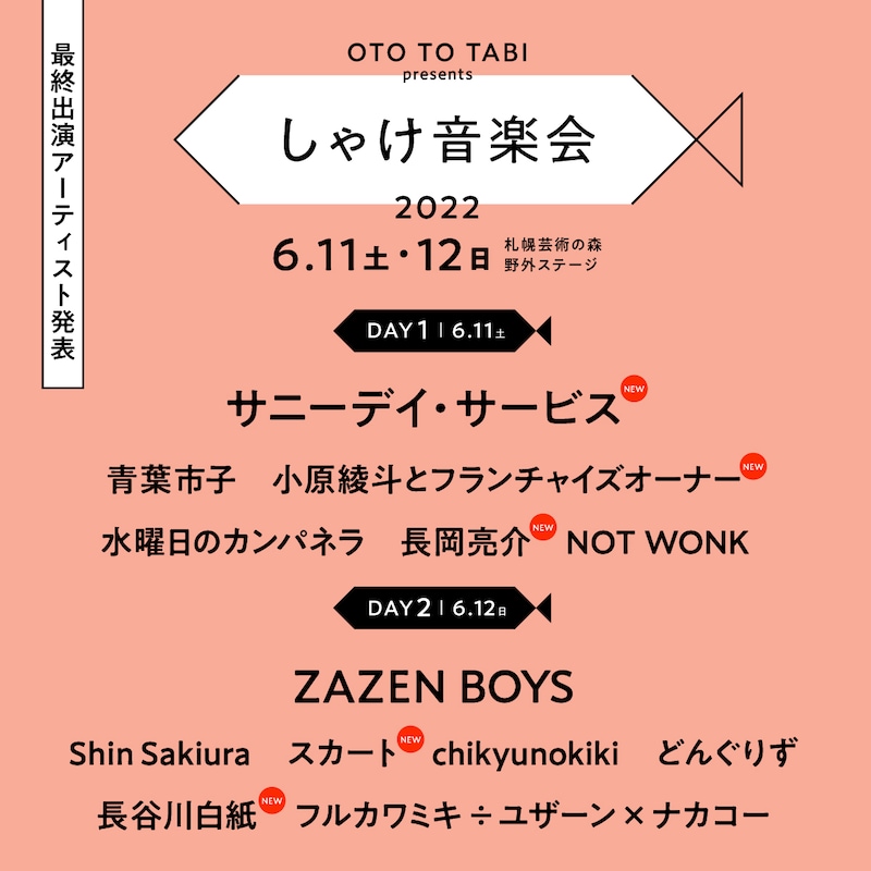 6月11、12日に北海道・札幌芸術の森 野外ステージで開催される音楽フェス「しゃけ音楽会」の最終出演アーティストが発表された。