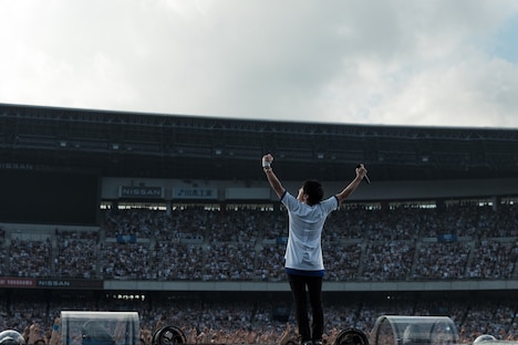 6月12日は関東地方の梅雨入りにより不安定な空模様となったが、開場した15時以降は晴天に恵まれた。抜けるような青空のもと、来場者約7万人がMr.Childrenの登場を今か今かと待ち構える中、「優しい歌」のストリングスバージョンが心地よい風に乗ってスタジアム中に響き渡る。その音が止むと、会場のスクリーンには、ベストアルバムのジャケットをモチーフにしたオープニングムービーならぬ“エントランス映像”が流れ始めた。さらにMr.Childrenの歩みをたどるように、過去作のジャケットやミュージックビデオ、ライブシーンも一挙に公開されたのち、舞台上のスクリーンがゆっくりと上昇し、メンバー4人、サポートのSUNNY(Key, Vo)が登場。桜井の力強いストロークで始まる「終わりなき旅」でライブは幕を開け、代表して桜井が「どんなものにも終わりはきっとある、そう思っています。だからこそ今ある情熱のすべてを音に、エネルギーに変えて人生最高のライブをお届けしたいと思います」と誓いを立てた。ノスタルジックな音像の「名もなき詩」がオーディエンスに捧げられたあと、ライブはMr.Childrenの近年のライブアンセムとも言うべき「海にて、心は裸になりたがる」へ。メンバーは視線を交わしながら強靭なアンサンブルを奏で、桜井や中川はステージに立つ喜びを噛み締めるように咆哮した。