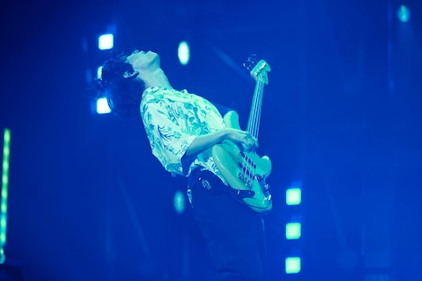 オレンジと赤のライティングに照らされて力強いアンサンブルが響いた「リトルブレイバー」のあとは、不穏なギターイントロから「乗車権」が始まり場内のムードが一変。スリリングなサウンドで再びオーディエンスのテンションは急上昇した。「Aurora」ではメンバーの煽りに応えて観客が息もぴったりなハンドクラップを鳴らし、オーロラのようにレーザー光線の波がゆらめく中で浮遊感と高揚感に満ちた演奏が繰り広げられた。藤原は「あと何曲かやったら終わっちゃうんだよ」とライブが終盤に近づいていることを明かすが、反応に困る客席の様子を見て「『えーっ!』て言いたいところだよね(笑)。俺も思っていた以上に感極まってて、すごく楽しくやらせてもらってます。ありがとう」とその思いを代弁した。