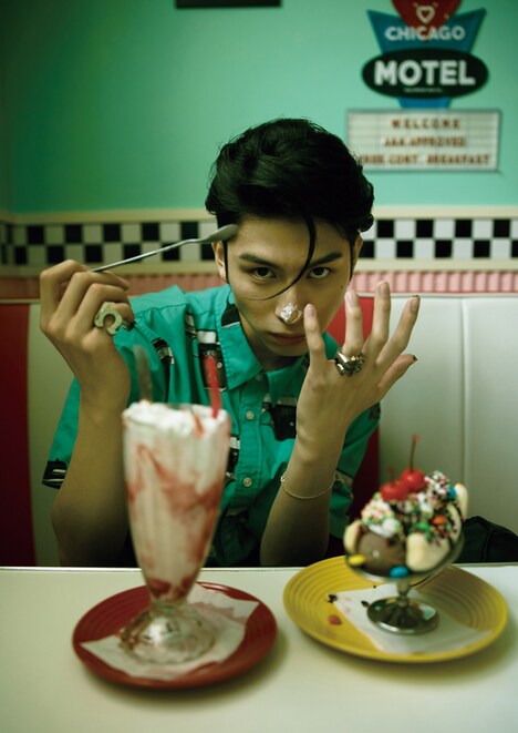 “6000”と言えば、「CHARACTER」は約6000枚のカットから長谷川自身が写真をセレクトし、160ページに収めた写真集。さまざまなシチュエーションやスタイルでのシューティングに挑戦した長谷川は「僕にはいろんなキャラクターがある」と思い、「CHARACTER」というタイトルがひらめいたという。会見では長谷川が4枚のお気に入りの写真をピックアップし、それぞれその理由を述べた。度々この写真集について話題になるのは、バスルームで撮影された8パックの腹筋をフィーチャーしたセクシーなカットだが、長谷川がまずお気に入りの1枚として選んだのは、その次に撮ったというアメリカンダイナーでパフェを食べている写真。このカットについて彼は「あの腹筋を作るまでに1カ月ちょっと食事制限をして、水抜きや塩抜きをして……そのあとに食べた初パフェだったので、このパフェが本当に輝いて見えたんです(笑)。ずっと我慢してきてやっと食べられたパフェという印象が強いですね。撮影を忘れて本当の笑顔を見せています」と説明した。