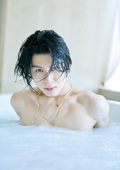 長谷川が2枚目に選んだのは、重厚感のある階段にChristian Diorのセットアップ衣装を着て佇むカット。「絶対にスーツのセットアップで写真を撮りたかったんです。パッと見たときに海外なのかなって思うほど、雰囲気のあるところで、ドシッと構えている感じがお気に入りです」と述べた。3枚目は泡風呂に胸まで浸かったリラックス感の写真で、「8パックの“脱ぎ”のシーンのあとに撮ったんですが、これは“見えないよさ”がある写真です。筋肉を意識しすぎず、ラフな感じですし、腹筋を見せる写真の撮影を終えてちょっと安堵の表情を浮かべています。濡れた髪もお気に入りです」と解説した。