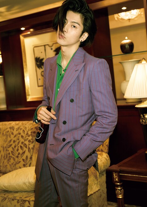 最後にピックアップしたのは、ビビッドなパープルスーツにグリーンのシャツを合わせた、まるで“ジョーカー”なカット。カメラマンとディスカッションをしていく中で「ストーリー性を大事にしたい」という思いが生まれた長谷川は、バーカウンターでお酒を飲んでいるカットから「何か悪さをして稼いだお金でお酒をめちゃめちゃ飲みまくって、ちょっと酔っ払っている姿」へとストーリーをつなげようと考えたという。「実際にはお酒を飲んでいないんですが、酔っ払ったときの自分を思い出して悪そうな感じを意識して撮影しました。今まで見せてこなかった表情なので、ファンの皆さんにもきっと新鮮に感じていただけると思う」と、写真集制作の中で出現した自身の新たな顔をアピールした。