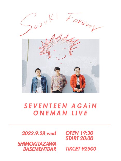 11月に行われる予定の自主企画「リプレイスメンツ」をもってスズキカズ(Dr)が脱退するSEVENTEEN AGAiN。「スズキフォーエバー」は現体制最後のワンマンで、チケットは当日券のみ用意される。