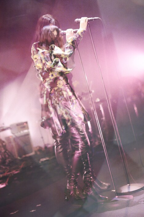 開演時刻を迎えると、暗がりの中adieuの朗読が流れ、ライブがスタート。その後adieuは、竹之内一彌(G)、小林修己(B)、上原俊亮(Dr)、福岡たかし(Per)、Yaffle(Key)からなるバンドメンバーとともにステージに姿を現し、「穴空きの空」を歌唱する。adieuはまるで後光を放つかのように照明の光を背中で浴びながら、力強さと儚さが共存する歌声を響かせた。その後、ヤナセジロウ(betcover!!)が手がけたアップテンポなナンバー「旅立ち」が披露されると、客席に手拍子が広がっていき、会場に一体感が作り出されていく。続けて歌唱された「花は揺れる」では、メロウなムードの演奏に乗せて柔らかな高音が響き渡り、adiueのボーカリストとしての魅力が浮き彫りになるようなパフォーマンスに、観客はじっと耳を傾けた。