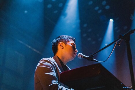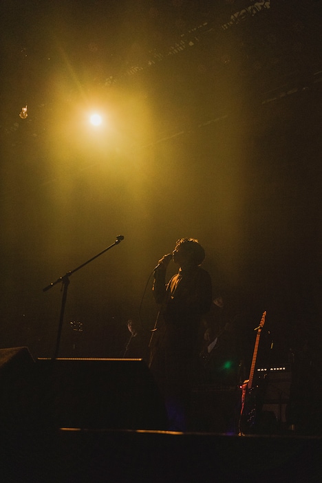 開演時間を迎え、Bialystocksとサポートメンバーがステージに登場するものの、会場内は薄暗いまま。1曲目「All Too Soon」の演奏が始まっても照明が明るくステージを照らすことはなく、ときおり逆光で彼らの姿が垣間見えるだけでステージの全容を確認することはできない。2曲目「花束」の演奏が始まり、バンドメンバーが一斉に音を鳴らすとようやくステージに光が当たり、この日の編成が甫木元空(Vo)と菊池剛(Key)のメンバー2人に西田修大(G)、越智俊介(B /