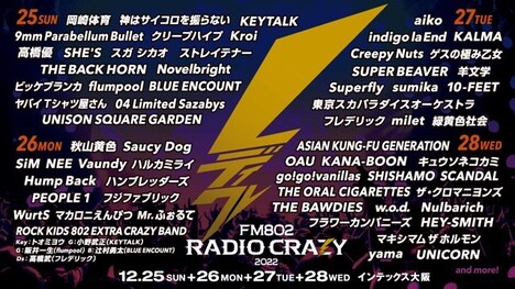 12月25~28日の4日間にわたり大阪・インテックス大阪で開催されるライブイベント「FM802 ROCK FESTIVAL RADIO CRAZY 2022」の出演アーティスト第1弾が発表された。