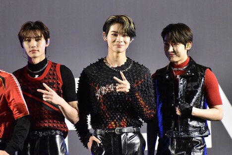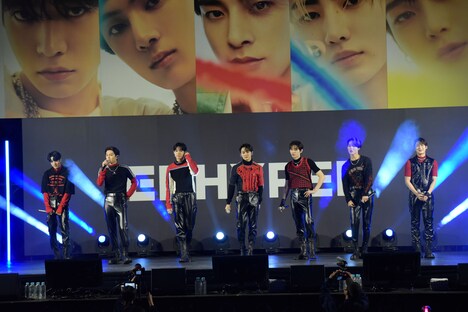 MC・古家正亨が「ENHYPENと過ごす最高の思い出を作っていきましょうね」と呼びかけたのち、スタイルのよさが際立つ赤と黒基調のトップスに身を包んだENHYPENが姿を見せる。登場するやいなや、マスコミ向けのフォトコール、ムービーコールに応じた7人。観客を背にした写真撮影の際には、ペンライトを大きく揺らすENGENEのほうを何度も振り返り、うれしそうな笑顔を浮かべていた。フォトコールを終えて一度退場した7人は、数分後に再びステージへ。ENGENEの期待感が渦巻き緊張感が漂う中、メンバーたちは「寒いですねー」と口にしながらステージの中央へ向かい、場を和ませていた。その後は疾走感あふれるギターのカッティングに乗せたJAYの歌唱で始まる「Make the change」でミニライブがスタート。メンバーたちは時折お互いの顔を見合わせるなど仲睦まじい様子を見せながら、楽曲をさわやかに歌い上げた。