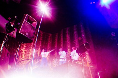 期待感の立ち込める会場に現れたのは、トップバッターの真空ジェシカ。川北茂澄はセンターマイクの前に立つやいなや「まーちゃんごめんね」と挨拶し、フロアを沸かせる。想像以上のウェルカムムードに驚きながらも「『まーちゃんごめんね』で拍手が起こるならイージーモード」とうそぶきつつ、Cody・Lee(李)のバンド名を引用しながら挨拶し、会場を盛り上げる。その後も川北は、ステージの袖にセッティングされていたCody・Lee(李)メンバーのギターを見つけて勝手に弾き語るなど、やりたい放題。このあとに控えるライブ用に設定されているであろうギターのコントロールノブを勝手にいじる川北に対し、ガクが「さすがにそれは触っちゃマズい……」と暴走を収めようとするなど、ミュージシャンと共演するこの日ならではのステージを繰り広げ、会場を爆笑で包み込んだ。