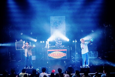 2番手のchelmicoはバックDJを務める%Cとともに登場。「Player」でパフォーマンスをスタートさせ、2人ならではの晴れやかな空気でいきなり会場を包み込む。2曲目「Highlight」では2人がハンドクラップを煽り、観客は体を小刻みに揺らしながら力強く手拍子を鳴らした。chelmicoは「真空ジェシカさんのあとにライブをすることがあるなんて光栄です」「そして、こんな素敵な機会を作ってくださったCody・Lee(李)にも拍手! すごい素敵なイベントじゃない?」と語ったのちに「O・La」を披露。観客に事前にレクチャーした振付で一体感をもたらし、そのまま「ISOGA♡PEACH」で会場をチアフルなムードに浸していった。「次はゆっくりした曲でクールダウンしてもらいたいと思います」というRachelの言葉に続けて披露されたのは「Meidaimae」と「Balloon」。2人はメロウなトラックとゆったりしたラップで観客を心地いい揺れへと誘う。そして最後に彼女たちは「Disco(Bad dance doesn't matter)」「Easy Breezy」とキラーチューンを立て続けにパフォーマンス。キレのあるラップで最後まで観客を目いっぱい踊らせ、ステージをあとにした。